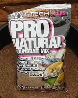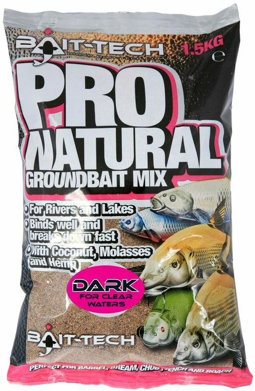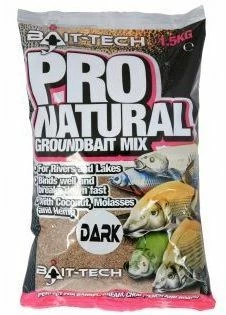 - The Bait Tech Pro Natural DARK Groundbait 1.5kg has been specifically designed for anglers who regularly target silver fish on natural venues. It has been manufactured utilising coconut, molasses and hemp, these tried and tested ingredients and particles work perfectly together to produce a sweet, aromatic groundbait, that once mixed up forms a groundbait that will still stick together well, making it perfect for balling in, yet break down quickly once on the bed of a river, drain, canal or lake to create an instant reaction.