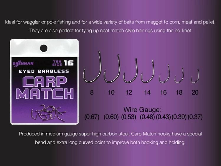 - Produced in medium gauge super high carbon steel carp match hooks have a special bend and extra long curved point to improve both hooking and holding.Ideal for waggler or pole fishing and for a wide variety of baits from maggot to corn, meat and pellet.