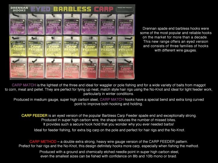- A double extra strong pattern using the same proven shape as the barbless carp feeder, perfect for Hair rigs and the no-knot this design definitely hooks more carp especially when fishing the method feeder. Produced with a ground and chemically etched needle point in super high carbon steel even the smallest sizes can be fished with confidence on 8lb or 10lb mono or braid.
