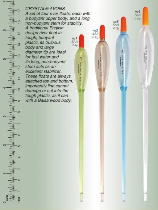 - Drennan Crystal Avons are a clear plastic float with a body shape based on the traditional Avon river float.