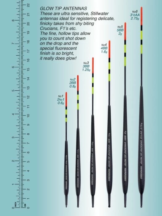 The Drennan Glow Tip Antenna Floats are excellent. The glow tip is very helpful in low light, and the size 3 is perfect for my fishing setup. Highly recommend!