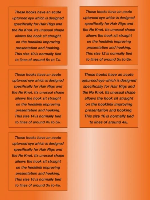 - Designed specifically for hair rigs and the no knot, the acite upturned eye on this wide gape pattern sits the hook dead straight on the hooklink providing improved presentation & hooking ratios.