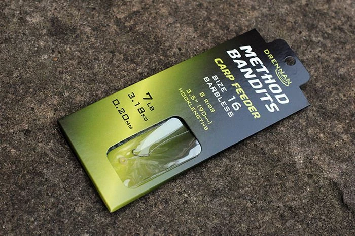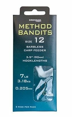 - Drennan Method Bandits are conÂvenient, pre-tied hookÂlengths comÂplete with hair-rigged latex bait bands and perÂfect for the Method feeder. Carp Feeder Method Bandits are matched to Carp Feeder hooks in sizes 8 to 16 and with hookÂlength diaÂmeters from 0.22mm (8lb) down to 0.20mm (7lb). Each hookÂlength is 90mm long, which we believe is the optimum length for an effective Method feeder or pellet feeder setup. The hair-rigged latex band can be used to mount a number of hook baits. It can be stretched around a hard pellet or dumbÂbell boilie with the help of a Drennan Band Stretcher. Alternatively, it can be pulled inside a soft pellet, drilled boilie or cube of meat with the help of a Drennan Pellet Band Puller. Method Bandits are indiÂviduÂally hand tied and, just like our already popÂular Carp Method Pushstop Hair Rigs, they are packed straight to avoid any chance of kinking.