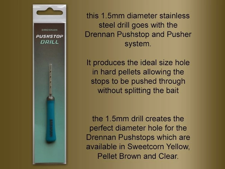 - This 1.5mm diameter stainless steel drill goes with the Drennan Quickstop and pusher system.