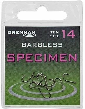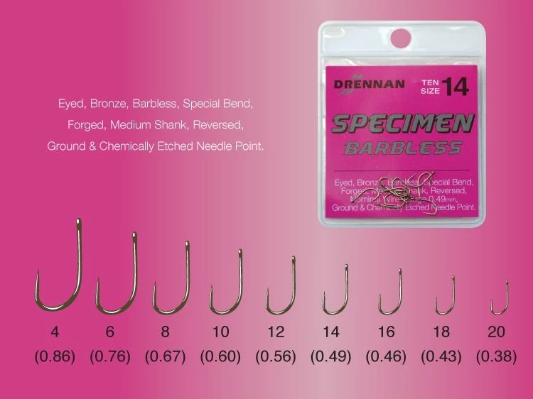 - Drennan New Generation Specimen BARBLESS Eyed hook has a forged 0.46mm high carbon wire with a chemically etched needle point.