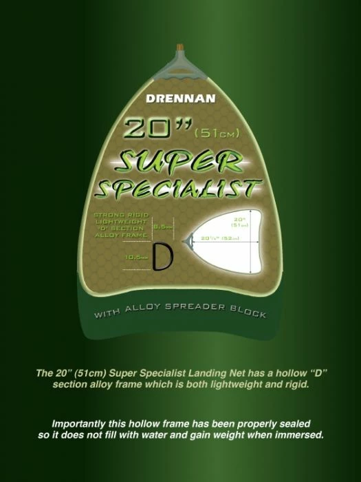 - The Super Specialist Landing Net has a hollow section alloy frame which is both lightweight and rigid, importantly sealed so it does not fill with water and gain weight when immersed.The net itself has a larger mesh on the sides to reduce water resistance & improve manoeuvrability and finer mesh on the base to cradle the fish.