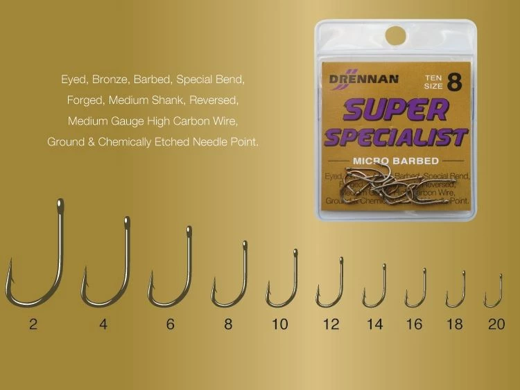 - Drennan New Generation Super Specialist Micro BARBED Eyed hooks are made from a medium gauge high carbon carbon wire with a ground and chemically etched needle point.