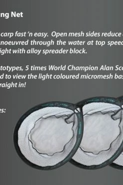 - The super strong spreader block is made from a high impact glass filled material which is reinforced for extra strength. The free flow mesh allows the head to be guided through the water with ease and the rigid frame can be literally forced through heavy weed when there is a lot of growth in the margins. The Specialist net fits perfectly to both our Big Fish and Stalker Telescopic Landing Net Handles making a great combination for targeting species like tench and bream in stillwaters as well as barbel and chub in the rivers.