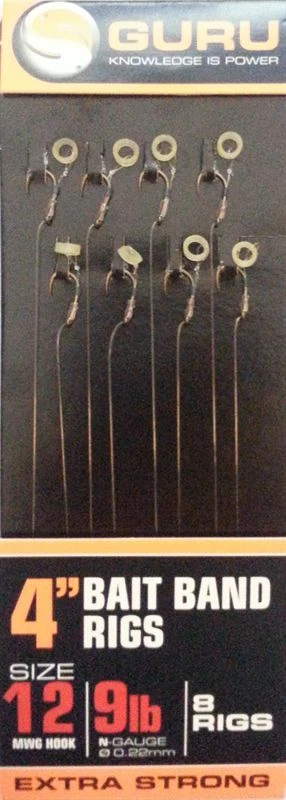 - Guru have taken their Speed stop design and incorporated it into a range of ready made rigs! Available in various breaking strains and hook sizes. They have also released a range of bait band rigs, these follow the same spec as the Speed Stop rigs, but simply feature a bait band on the end of the each.