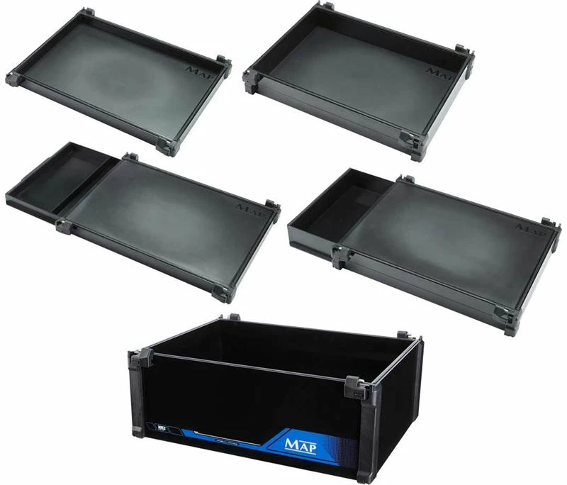 - A collection of seatbox spares that include a shallow drawer unit, shallow tray unit, deep drawer unit, deep tray unit and 150mm base unit.