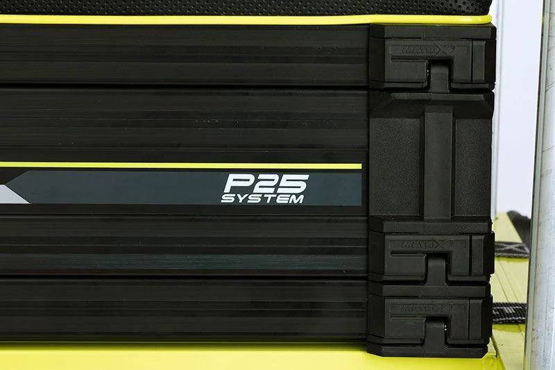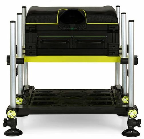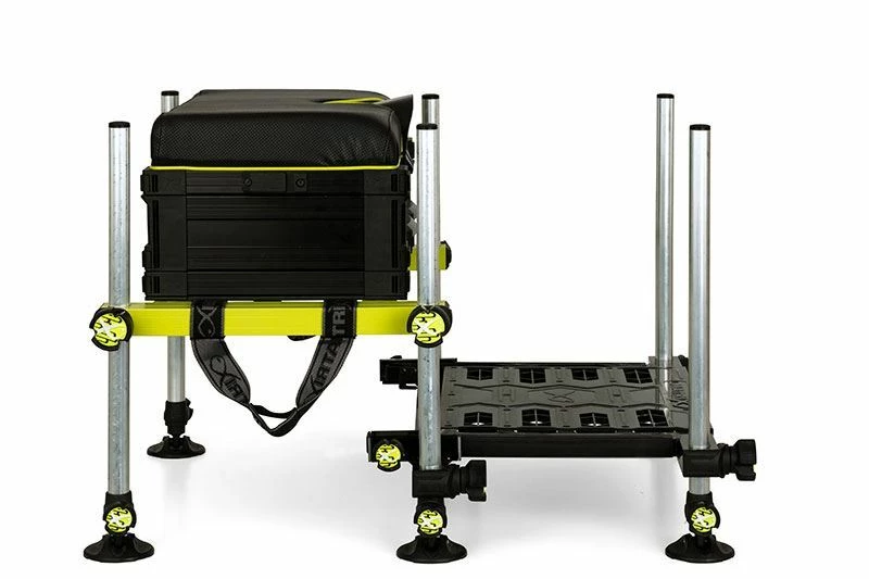 - Improved design featuring a non-scratch sliding footplate locking mechanism coupled with enlarged mud feet – all built onto a lightweight aluminium ‘H’ frame for superb all-round stability. Also included is an adjustable, extra padded shoulder strap, deep double front drawer and single tray unit for storing plenty of tackle.