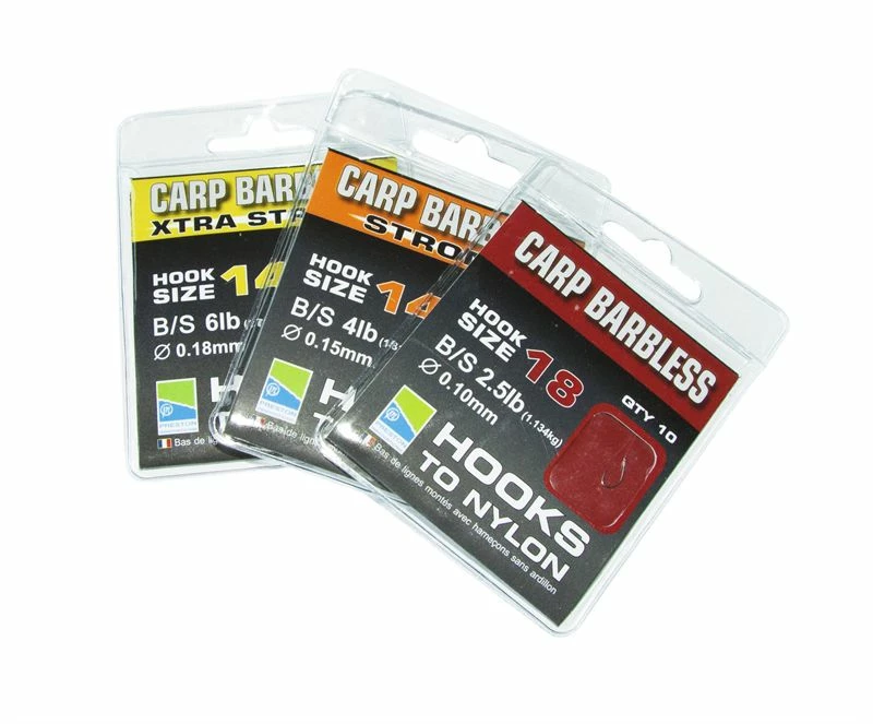 - Carp Barbless Hooks to Nylon are available in Standard, Strong and Xtra Strong versions to meet the requirements of the modern commercial carp angler. Super sharp, they are available in a range of sizes tied to popular breaking strains of high quality mono line. Suitable for a wide variety of baits and perfect for all fishing situations.
