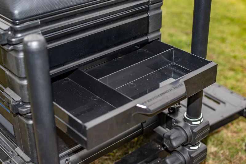 Now coming with a deeper 150mm base unit so it can store larger tackle items you may previously have had to store elsewhere and a one piece central unit taking two front and one deep side drawer each supplied with handy dividers to help you organise your bits and bobs. As with the rest of the range, these drawers are secured in place with the patented Mag-Lok clip system securing all the units in transit and providing easy access to the various drawers when in position.