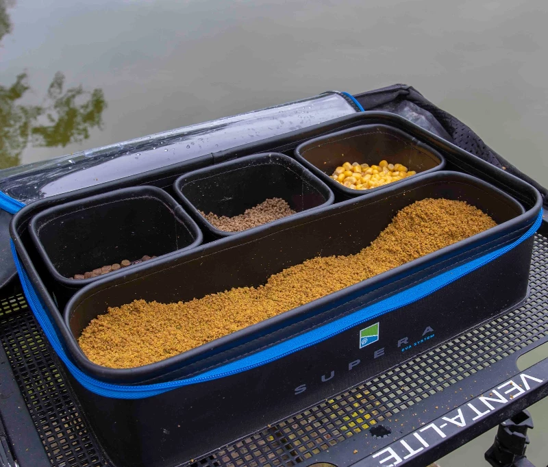 - A versatile bait storage solution that comes with three small and one large bait tubs that all fit snugly inside the main bag. Manufactured from tough waterproof material and with a handy see through zipped lid that you can fold over top to protect your bait from the elements, but still see inside.Â