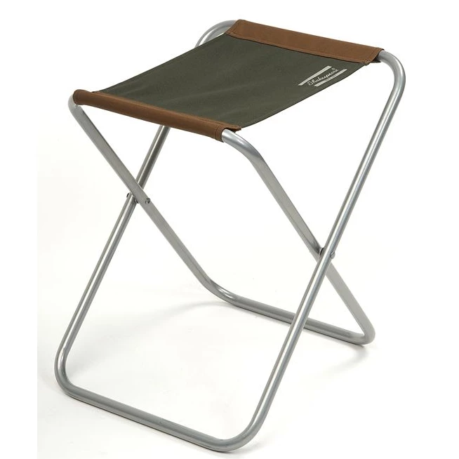 A robust must-have folding stool in green and tan with a silver frame.Â